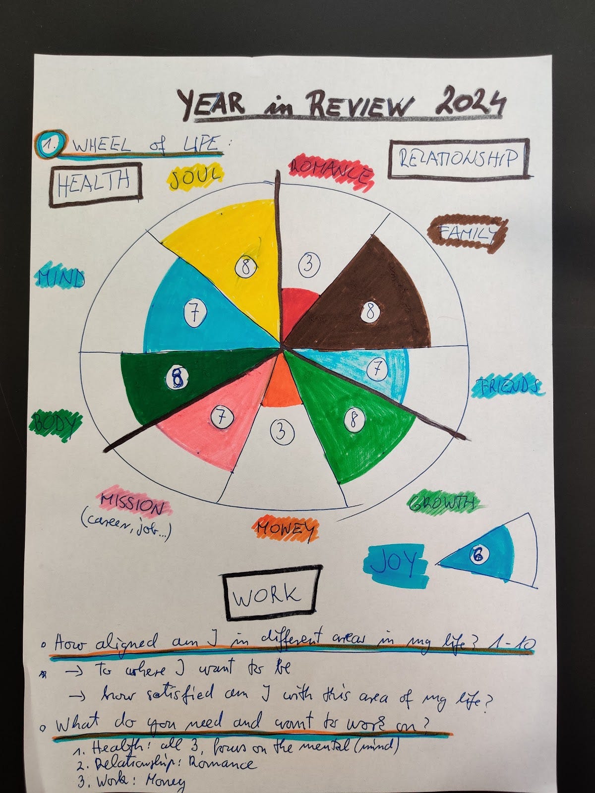 Pri analiziranju leta sem si poleg mojega dnevnika, kamor pišem misli in osebno “spovednico” (včasih dnevno, včasih nekajkrat tedensko), in planerja Ustvarjam sanjsko leto, kamor dnevno pišem highlighte dnevov in spoznanja, lekcije in nauke tedna, sem si pomagal še s t.i. kolesom življenja (angleško the wheel of life) in s spletnim ocenjevalnikom Mindvalley Life Assessment.